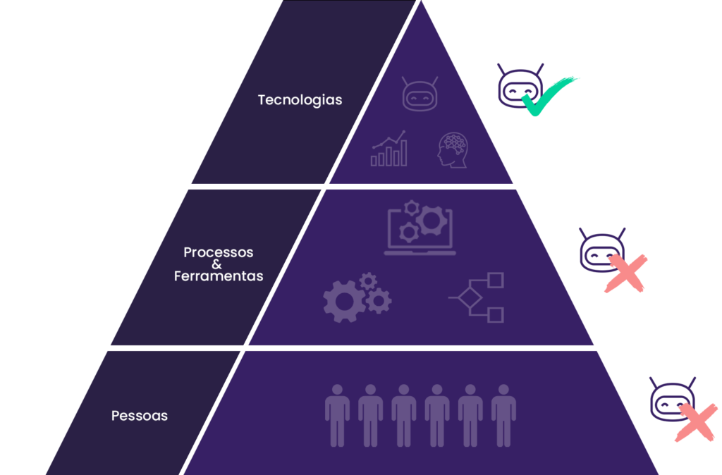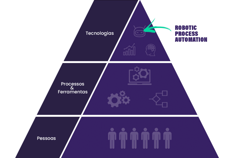 Esta é a fase onde o RPA encontra-se presente! Como já sabemos, para que a implementação de qualquer ferramenta de otimização seja bem sucedida, a “pirâmide” deve possuir uma base sólida (pessoas e processos). A cultura presente no primeiro nível representado na pirâmide é o que na maioria das vezes ditará a taxa de sucesso na implementação de ferramentas como o RPA.